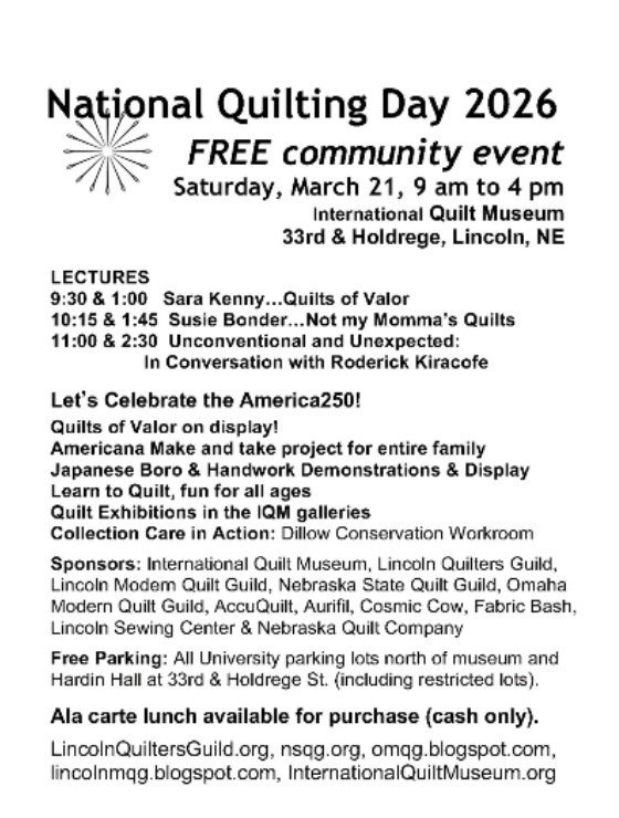 The International Quilt Museum will be participating in Lincoln’s First Friday event series: Both the First Friday event and the workshop are free. Registration details for the workshop are included in this flyer link. Members of the Lincoln Quilters Guild are invited to attend one or both of the events listed below